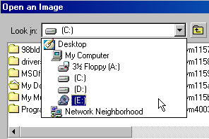 In the Look in box, scroll down to your CD drive (it may be different from the E drive which is used in this example), and click on it to select it.