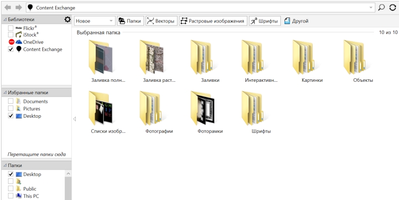 Content Exchange предоставляет подборку рисунков, фотографий, шрифтов, рамок, векторных и растровых узоров и списков изображений. Можно просмотреть доступный контент или выполнить поиск по ключевым словам, пометить избранный контент, проголосовать за понравившийся контент или скопировать контент из Content Exchange в личную папку.