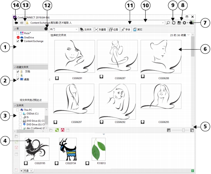 Corel CONNECT 是用于查找和管理内容的独立实用程序。CorelDRAW Graphics Suite 中提供此工具。