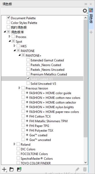 调色板库包含多个调色板的集合。您可以控制默认调色板,如默认 RGB 和默认 CMYK 调色板的显示。包含的主要调色板库是印刷色和专色。