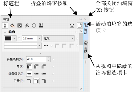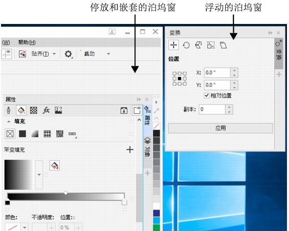 泊坞窗显示与对话框类型相同的控件,如命令按钮、选项和列表框。与大多数对话框不同,泊坞窗可以在操作文档时一直打开,便于使用各种命令来尝试不同的效果。泊坞窗的功能与其他图形程序中调色板的功能类似。