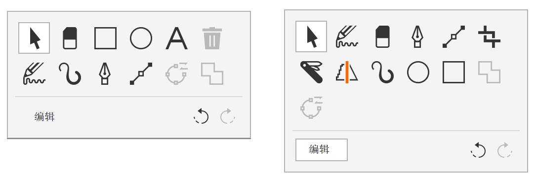 左:默认的工具面板。右:自定义的工具面板。在此示例中,添加了新工具(裁剪、刻刀和智能绘图);移除了删除按钮;并对工具进行了重新排列。