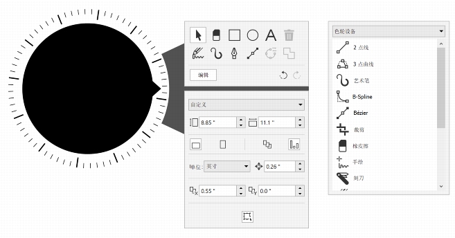 | 工具和属性面板将显示在色轮设备旁边。 |