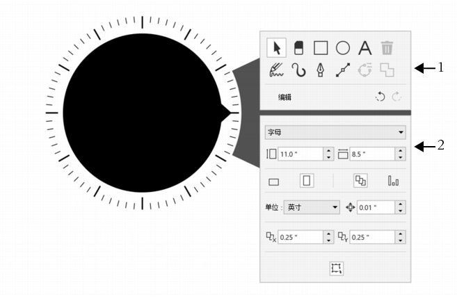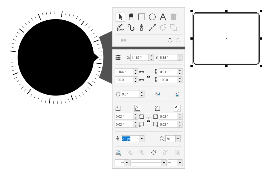 属性面板与属性栏类似。它包括与选定工具和对象相关的控件。每次在工具面板上切换工具时,属性面板都会相应更新,使您可以同时编辑工具和对象属性。例如,如果您在绘图窗口中选择了对象,您可以使用属性面板快速调整对象宽度、高度和轮廓宽度,并且还可以生成对象的镜像和旋转对象。此外,如果您需要调整属性值,色轮设备可帮助您进行精确调整。