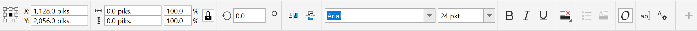 Na przykład, po kliknięciu narzędzia Tekst w przyborniku na pasku właściwości wyświetlane są jedynie polecenia związane z tekstem. W poniższym przykładzie na pasku właściwości widoczne są narzędzia formatowania, wyrównywania i edycji tekstu.