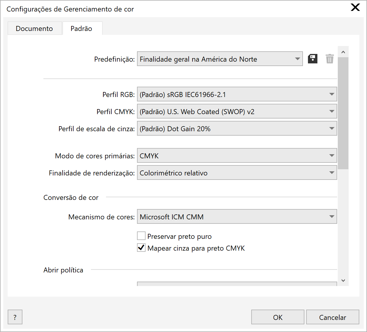 Conversão de cor — controla a correspondência entre as cores ao converter cores de um perfil de cores para outro. Por exemplo, você pode alterar o mecanismo de cores ou especificar opções para converter cores preto puro em documentos RGB, CMYK, Lab ou em tons de cinza. Para obter mais informações, consulte configurações de conversão de cores.