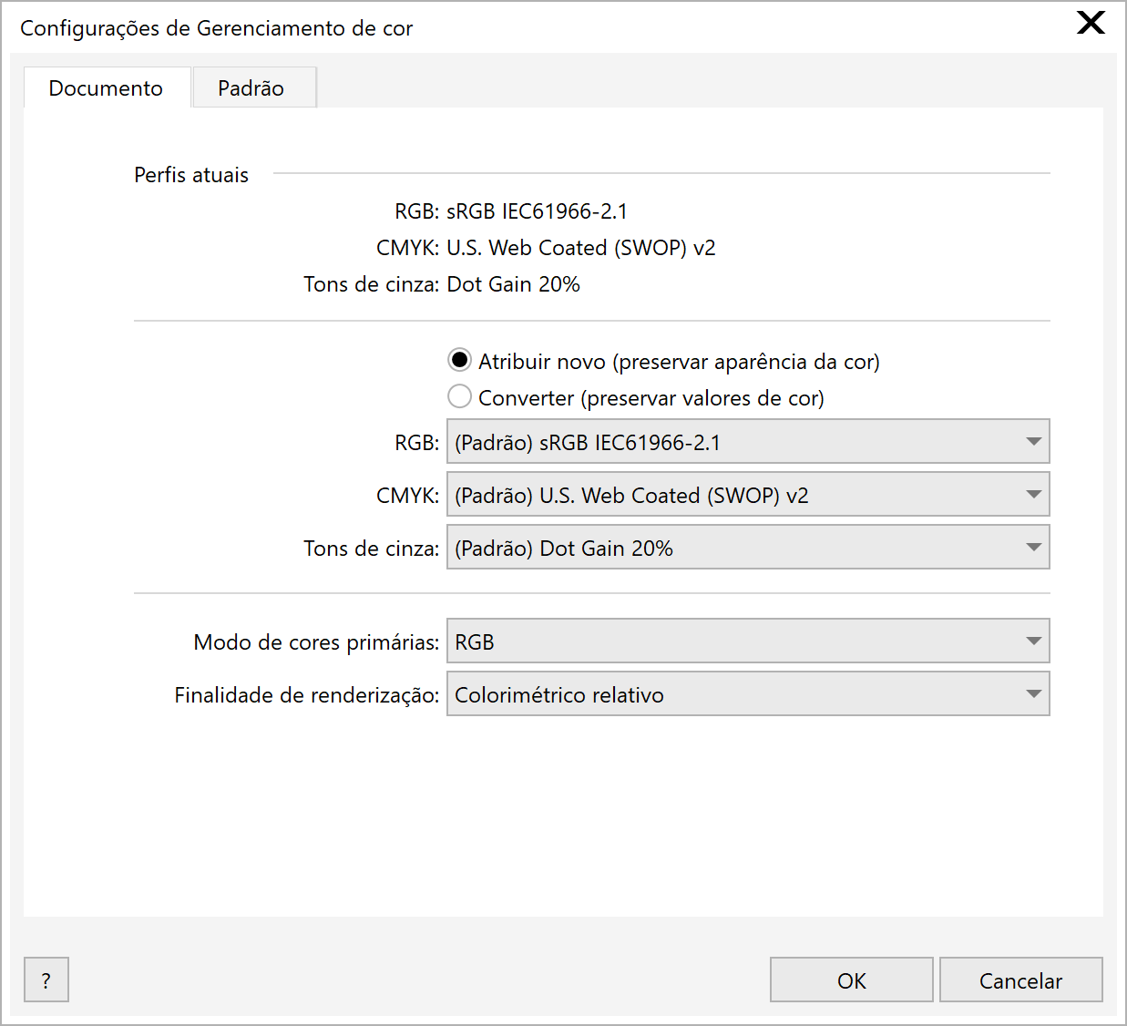 Modo de cor primário — determina a paleta de cores do documento exibida quando se abre ou inicia um documento, assim como o modo de cor padrão de um documento exportado como um bitmap. O modo de cor primário é definido para todos os documentos novos e não identificados, mas é possível alterar essa configuração para o documento ativo na guia Documento da caixa de diálogo Configurações de gerenciamento de cores. Observe que o modo de cor primário não limita as cores em um documento do CorelDRAW a um único modo de cor.