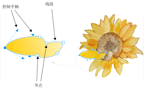 曲线对象具有节点和控制手柄,它们可用于更改对象的形状。曲线对象可以为任何形状,包括直线或曲线。对象节点为沿对象轮廓显示的小形状。两个节点之间的线条称为线段。线段可以是曲线或直线。对于连接到节点的每个曲线线段,每个节点都有一个控制手柄。控制手柄有助于调整线段的曲度。