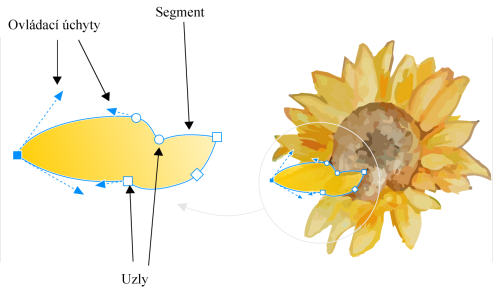 Součásti křivky: ovládací úchyty, segmenty a uzly