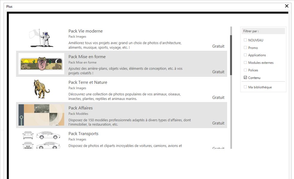La boîte de dialogue Plus vous permet de télécharger des cliparts, des photos, des polices, des applications, etc.