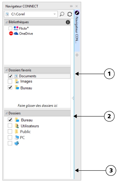 Le volet Dossiers favoris permet de créer des raccourcis vers des dossiers auxquels vous accédez régulièrement. Vous pouvez ajouter des emplacements ou en supprimer dans le volet Dossiers favoris.