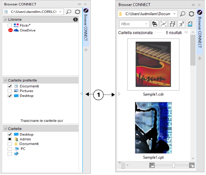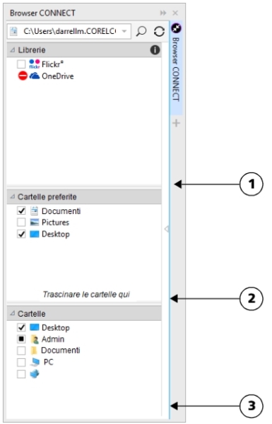 CONNECT Browser presenta due modalità di visualizzazione: riquadro singolo e visualizzazione completa. In visualizzazione completa sono visualizzati tutti i riquadri. In modalità riquadro singolo vengono visualizzati il riquadro di visualizzazione oppure i riquadri Librerie, Cartelle preferite e Cartelle. È possibile ridimensionare la finestra mobile per visualizzare tutti i riquadri oppure è possibile passare dal riquadro di visualizzazione ai riquadri Librerie, Cartelle preferite e Cartelle e viceversa.