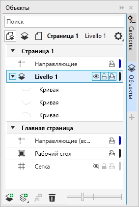 Если отключить редактирование всех объектов незакрытых слоев, то можно будет работать только с активным слоем и слоем рабочего стола. Невозможно выбирать или редактировать объекты на неактивных слоях. Например, если с помощью инструмента Указатель выделить рамкой несколько объектов на странице рисования, то будут выбраны объекты только на активном слое.