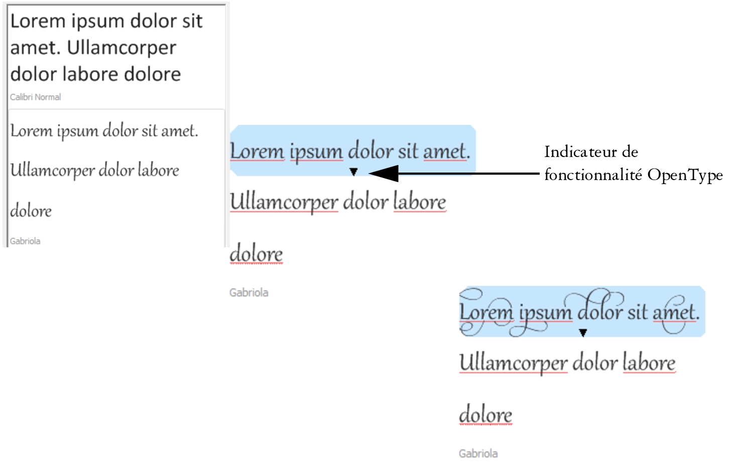 Lorsqu’un exemple de texte utilise une police OpenType, vous pouvez afficher les fonctionnalités OpenType et les appliquer à l’exemple de texte.