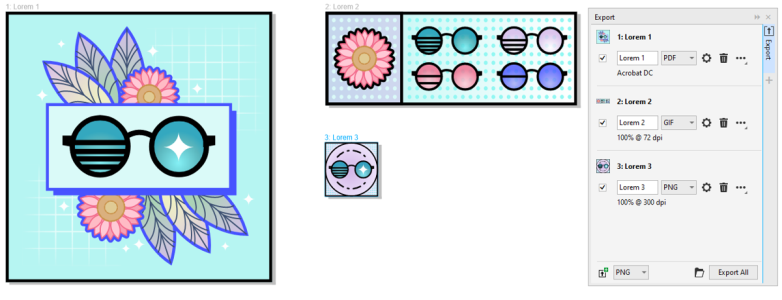 CorelDRAW 2021 vous permet de créer une liste personnalisée de ressources à exporter en un seul clic. Le nouveau menu fixe Exporter offre une gamme d’options flexibles permettant de gagner du temps pour sortir des pages et des objets.