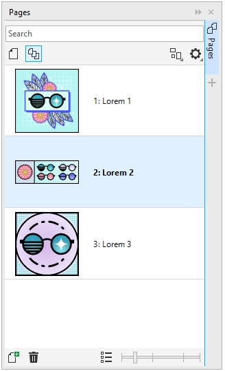 CorelDRAW2021 simplifie le travail avec des documents multipages grâce au nouveau menu fixe Pages. Il répertorie toutes les pages d’une conception pour vous permettre de les gérer facilement et de naviguer rapidement dans un projet. Chaque page dispose d’un aperçu miniature évolutif qui reflète sa taille et son contenu. Pour réorganiser les pages, il suffit de les faire glisser dans le menu fixe. De plus, vous pouvez ajouter, supprimer et renommer des pages en un seul endroit, ce qui vous permet d’économiser du temps et des efforts. Et en un clic, vous pouvez changer de mode d’affichage pour vous concentrer sur une seule page ou utiliser le nouvel affichage multipage. Pour plus d’informations, reportez-vous à la section Pages.