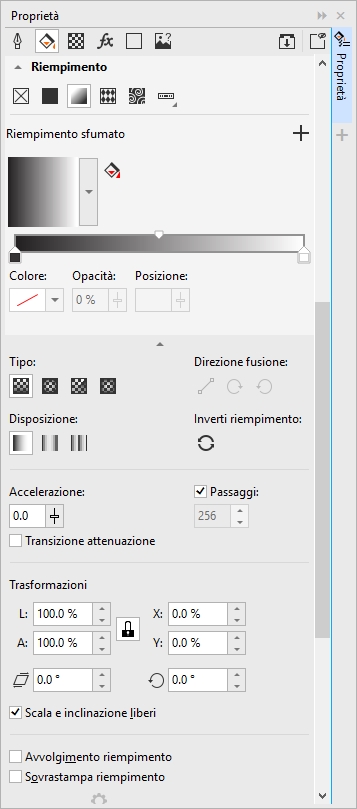 Quando la casella Passaggi sfumatura è bloccata, il numero di passaggi del riempimento sfumato stampato viene determinato dal valore specificato nella finestra di dialogo Stampa. Per informazioni sull'impostazione dei passaggi riempimento sfumato per la stampa, consultare Ottimizzare i lavori di stampa.