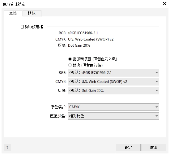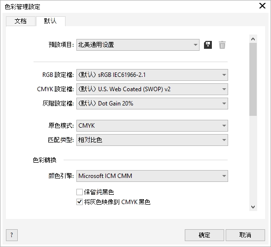 在「 色彩管理設定」對話方塊的「 預設」標籤中變更主要色彩模式不會影響到使用中的文件。
