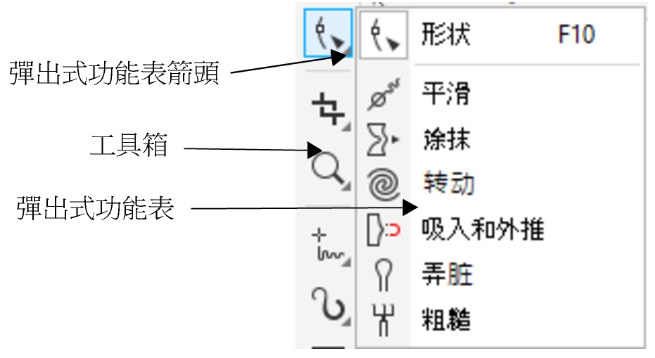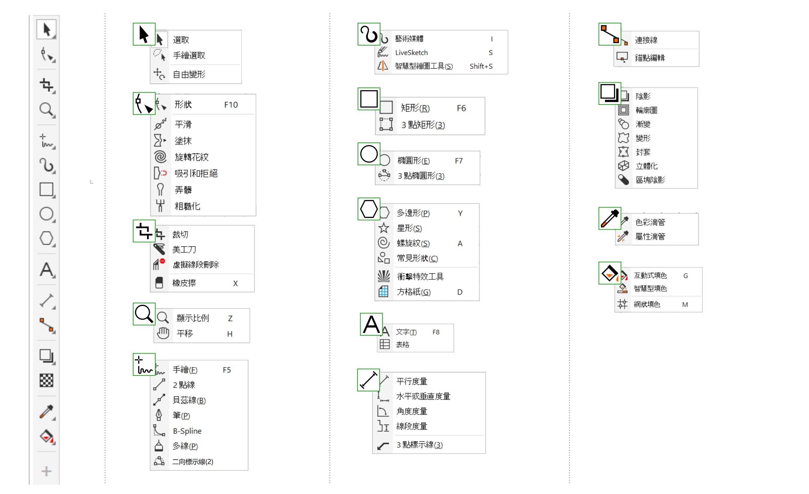 以下的插圖顯示在預設的 CorelDRAW 工具箱中所有的彈出式功能表,能協助您更輕易地找出工具。