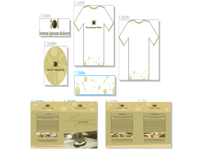 Os ativos de marca e de marketing para uma empresa de panificação foram organizados em páginas diferentes em um documento: (página 1) sacola; (página 2 e 3) cartão de visita; (página 4) certificado de presente; (página 5, 6-7 e 8) menu; (9) embalagem