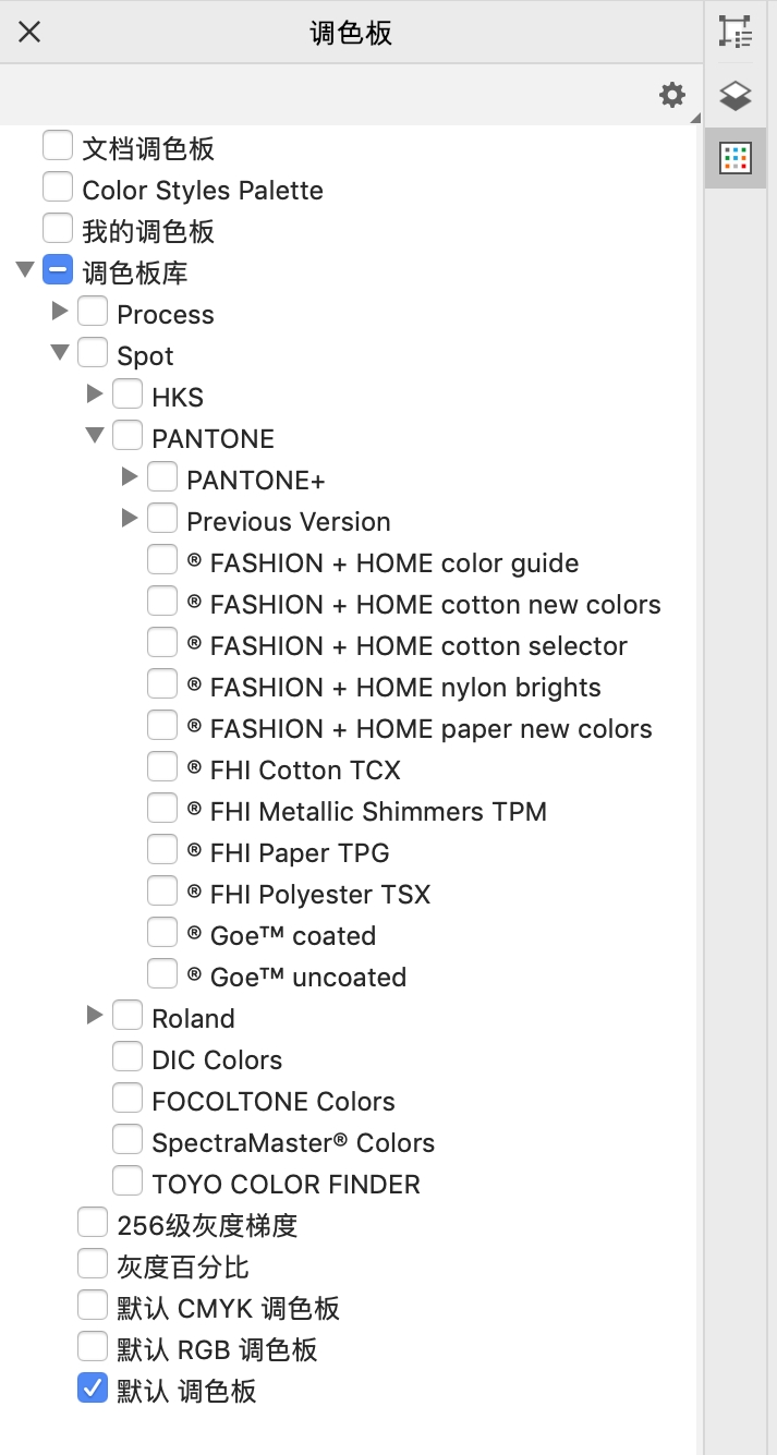 调色板库包含多个调色板的集合。您可以控制默认调色板,如默认 RGB 和默认 CMYK 调色板的显示。包含的主要调色板库是印刷色和专色。