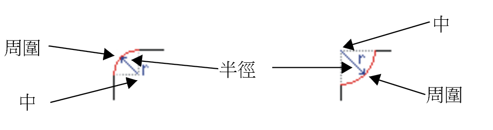 若要繪製有圓角、扇形角或凹角的矩形或方形,您必須指定邊角大小。建立圓角和扇形角時,邊角大小會決定邊角半徑。半徑會從曲線的中心點測量至其周圍。邊角大小的值越高,圓角越圓或扇形角越深。
