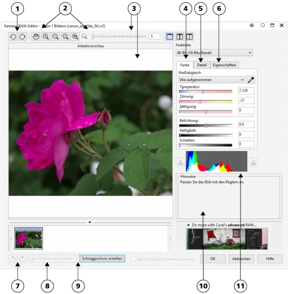 Wenn Sie eine oder auch mehrere RAW-Kameradateien in CorelDRAW öffnen, werden diese zunächst im Kamera-RAW-Editor angezeigt. Mithilfe der Optionen und Steuerelemente im Kamera-RAW-Editor können Sie Farbe und Ton der Bilder der RAW-Kameradateien anpassen. Sind Sie mit dem Ergebnis der jeweiligen Änderungen und Anpassungen einer Datei zufrieden, können Sie die gleichen Anpassungen auch auf die anderen Dateien anwenden.