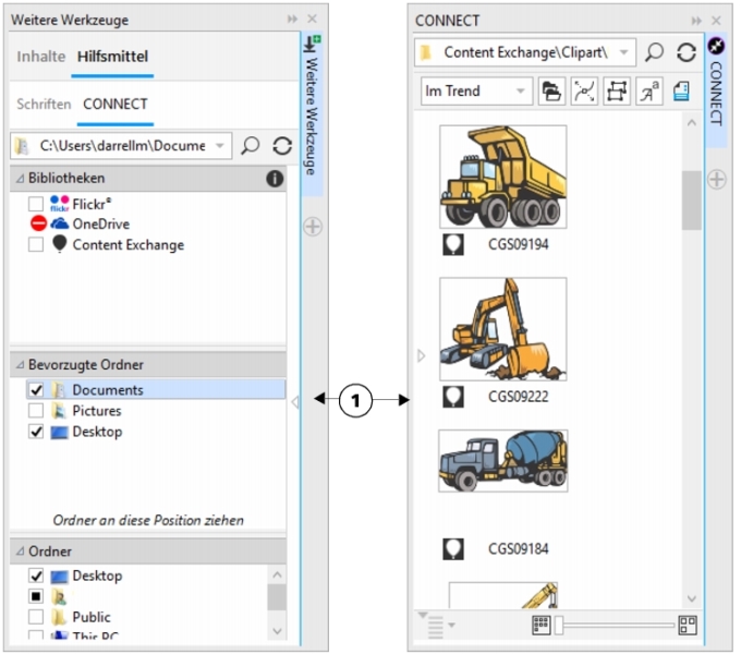 Sie können mithilfe vom Andockfenster CONNECT Inhalte durchsuchen und gezielt nach bestimmten Inhalten suchen. Im Andockfenster Ablage können Sie Inhalte für die spätere Nutzung bereitlegen.