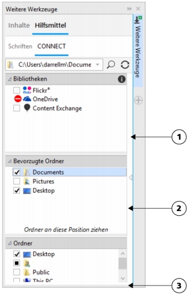 Im Andockfenster CONNECT sind zwei Anzeigemodi verfügbar: Einzelfenster und vollständige Ansicht. In der vollständigen Ansicht werden alle Fenster angezeigt. Im Einzelfenster werden entweder das Ansichtsfenster oder die Fenster Bibliotheken, Bevorzugte Ordner und Ordner angezeigt. Sie können die Größe des Andockfensters so ändern, dass alle Fenster angezeigt werden oder dass Sie zwischen dem Ansichtsfenster und den Fenstern Bibliotheken, Bevorzugte Ordner und Ordner wechseln können.