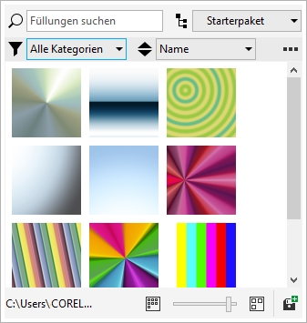 Damit Sie sofort beginnen können, stellt Ihnen Corel lokal verfügbare Füllungen bereit. Sie finden diese in der Auswahl Füllung und der Auswahl Transparenz unter Benutzerinhalte. Diese Füllungen werden im Ordner Eigene Dateien\Corel\Corel Content\Fills gespeichert. Wenn Sie Ihre Füllungssammlung erweitern möchten, können Sie über das Dialogfeld Weitere Werkzeuge zusätzliche Füllungspakete herunterladen.
