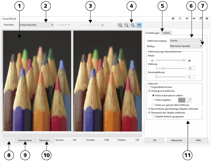 Das Dialogfeld PowerTRACE enthält Steuerelemente, über die Sie die Vektorisierungsergebnisse in einer Vorschau anzeigen und bearbeiten können.