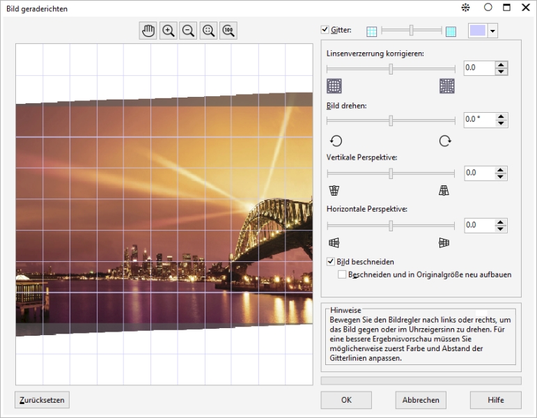 Mit dem Dialogfeld Bilder geraderichten können Sie Linsenverzerrungen korrigieren und Bitmap-Bilder schnell geraderichten. Diese Funktion eignet sich gut zum Begradigen von Fotos, die schräg aufgenommen bzw. gescannt wurden oder Linsenverzerrungen aufweisen.