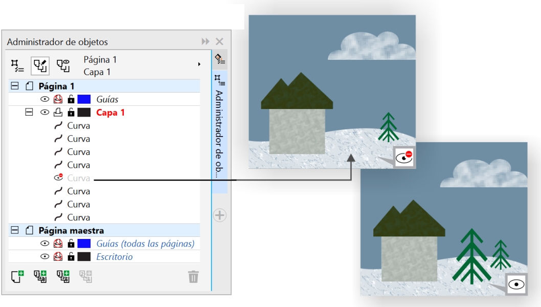 Cuando un objeto está oculto, en la ventana acoplable Objetos, se muestra un icono de ojo junto al nombre.