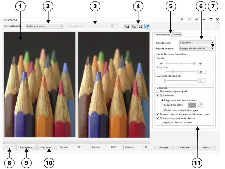 Contiene controles para ajustar la imagen vectorizada. El área Detalle de resultado de vectorización en la página Configuración le permite ver el número de objetos, nodos y colores en la imagen vectorizada mientras aplica ajustes.
