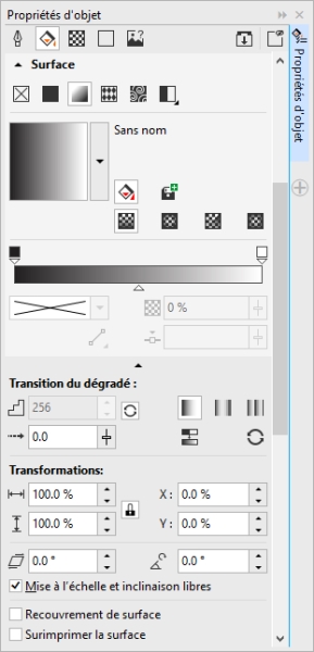 | 3 . | Dans la section Surface du menu fixe Propriétés d’objet, cliquez sur le bouton Surface dégradée |