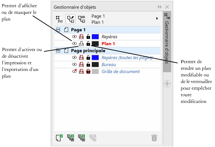 Les icônes situées à gauche du nom d’un plan permettent de modifier les propriétés de ce plan.