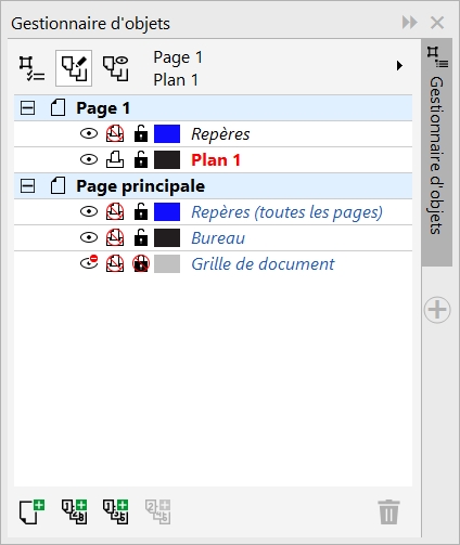 Le menu fixe Gestionnaire d’objets affiche la structure des plans par défaut. Le nom de la page active et celui du plan actif s’affichent en haut.