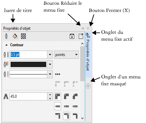 Le menu fixe Propriétés d’objet en est un exemple. Lorsque ce menu fixe est ouvert, vous pouvez cliquer sur un objet dans la fenêtre de dessin afin d’accéder à plusieurs options de modification des propriétés d’objet.
