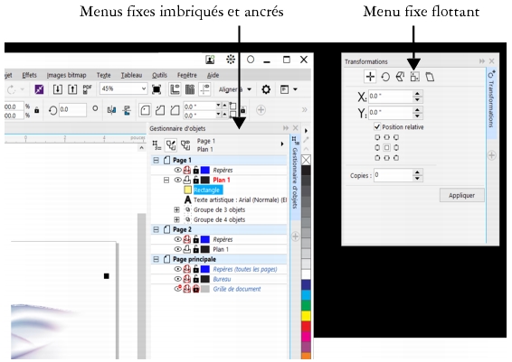 Dans cet exemple, les menus fixes Propriétés d’objet et Gestionnaire d’objets sont ancrés et imbriqués. Le menu fixe Transformations est flottant.