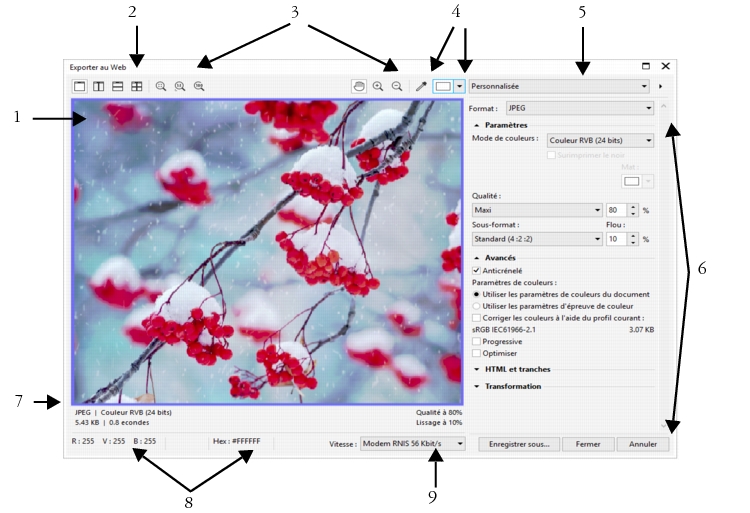 | Pour définir les paramètres de couleurs à utiliser pour exporter des images bitmap compatibles avec le Web |