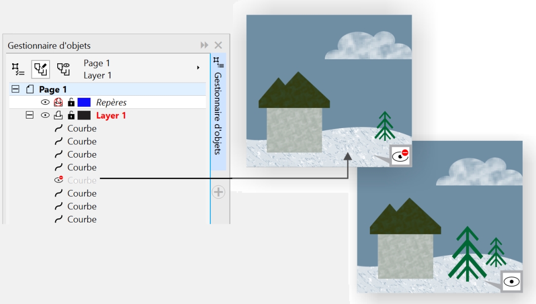 Lorsqu’un objet est masqué, dans le menu fixe Objets une icône Œil s’affiche en regard du nom de l’objet.