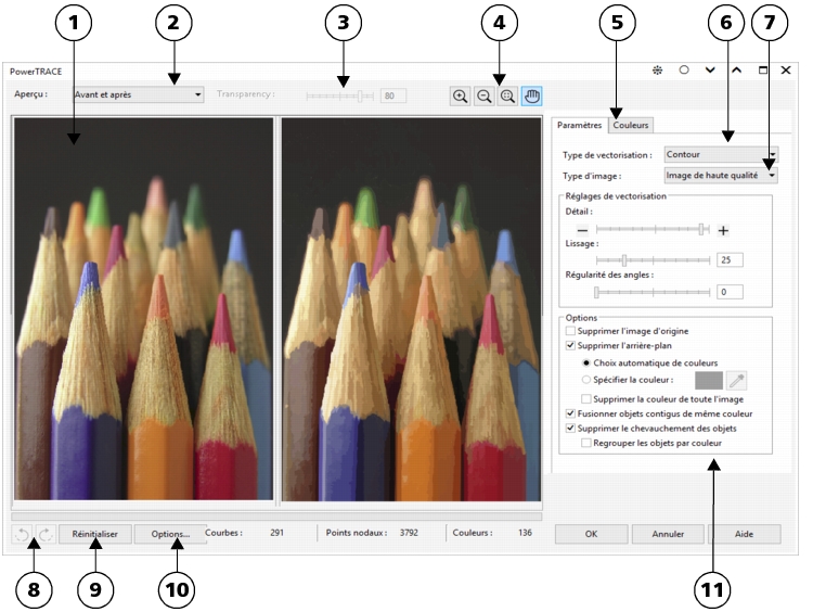 La boîte de dialogue PowerTRACE contient des commandes qui vous permettront de prévisualiser et de modifier les résultats de la vectorisation.