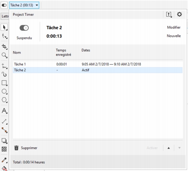 | 1 . | Cliquez sur la flèche déroulante vers le bas de la barre d’outils Minuteur de projet pour afficher le panneau Minuteur de projet. |