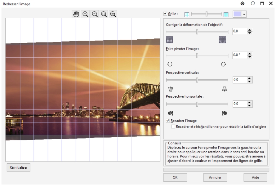 La boîte de dialogue Redresser l’image permet de corriger des déformations de l’objectif et de redresser rapidement des images bitmap. Cette fonctionnalité est pratique pour redresser des photos prises ou numérisées en biais, ou qui contiennent des déformations de l’objectif.