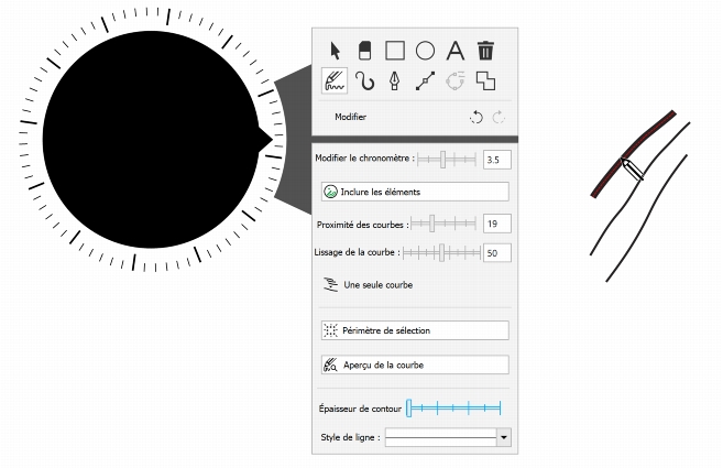 Votre molette peut s’avérer particulièrement utile lorsque vous réalisez des croquis à l’aide de l’outil LiveSketch. En mode hors écran, vous pouvez utiliser la molette pour annuler et rétablir facilement vos coups de pinceau. En mode à l’écran, vous pouvez ajuster le temps nécessaire pour affiner vos coups de pinceau et définir d’autres propriétés de l’outil et des coups de pinceau. De plus, il ne sera pas nécessaire de réinitialiser le chronomètre à l’aide du clavier, et vos coups de pinceaux seront instantanément ajustés dans les deux modes de la molette.