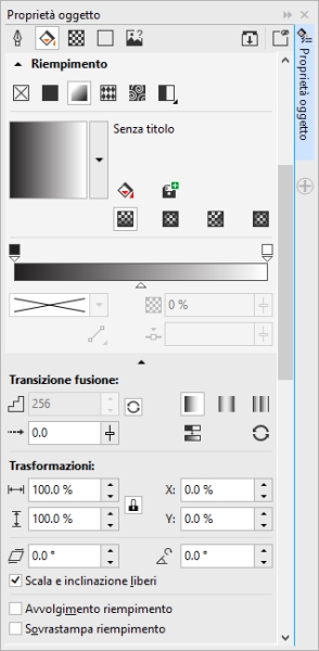 Nella sezione Riempimento della finestra mobile Proprietà oggetto fare clic sul pulsante Riempimento sfumato per visualizzare le opzioni relative al riempimento sfumato. |