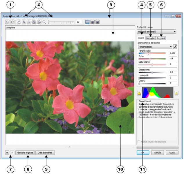 | 3 . | Nel Camera RAW Lab, regolare il colore e il tono dell'immagine fotocamera RAW. Se necessario, è possibile anche rendere più nitida l'immagine e ridurre il disturbo. |
