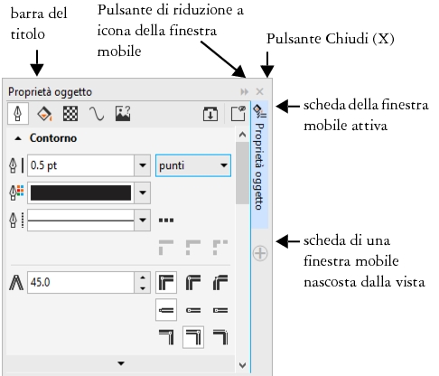 È anche possibile chiudere una finestra mobile facendo clic sul pulsante X nella relativa barra del titolo. Facendo clic sul pulsante X nella barra del titolo vengono chiuse tutte le finestre nidificate in un gruppo. Per chiudere solo una finestra mobile specifica, fare clic sul pulsante X nella scheda della finestra mobile.