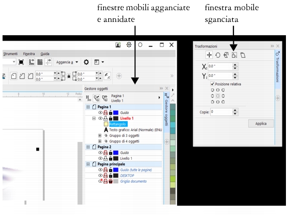 In questo esempio, le finestre mobili Proprietà oggetto e Gestore oggetti sono agganciate e nidificate. La finestra mobile Trasformazioni è sganciata.