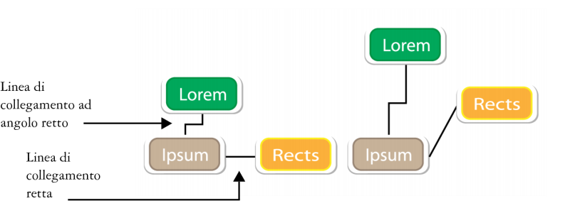 È possibile tracciare linee di collegamento tra gli oggetti. Gli oggetti rimangono collegati da queste linee anche quando li si sposta entrambi o individualmente. Le linee di collegamento, note anche come "linee di flusso", vengono utilizzate nei disegni tecnici come i diagrammi, i diagrammi di flusso e gli schemi. Per informazioni sulle forme dei diagrammi di flusso, consultare Disegno di forme predefinite.